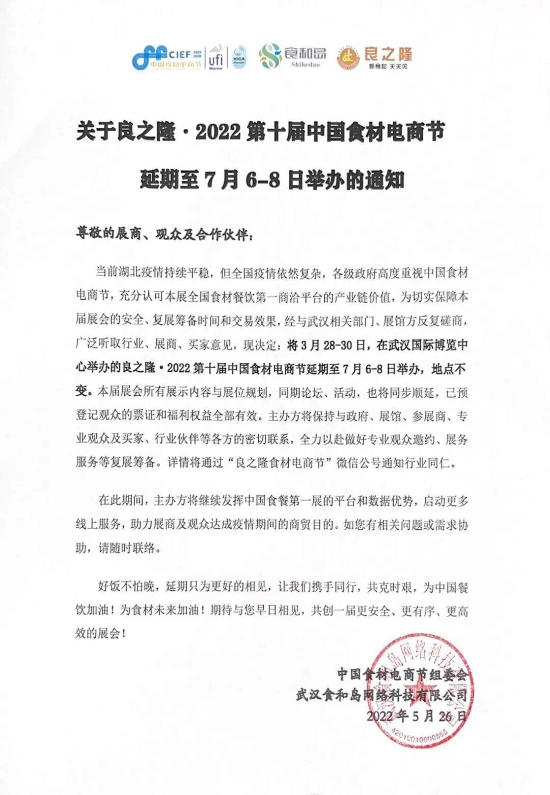 當(dāng)前湖北疫情持續(xù)平穩(wěn),但全國疫情依然復(fù)雜,各級(jí)政府高度重視中國食材電商節(jié),充分認(rèn)可本展全國食材餐飲第一商洽平臺(tái)的產(chǎn)業(yè)鏈價(jià)值,為切實(shí)保障本屆展會(huì)的安全、復(fù)展籌備時(shí)間和交易效果,經(jīng)與武漢相關(guān)部門、展館方反復(fù)磋商,廣泛聽取行業(yè)、展商、買家意見,現(xiàn)決定:將3月28-30日,在武漢國際博覽中心舉辦的良之隆·2022第十屆中國食材電商節(jié)延期至7月6-8日舉辦,地點(diǎn)不變。本屆展會(huì)所有展示內(nèi)容與展位規(guī)劃,同期論壇、活動(dòng),也將同步順延,已預(yù)登記觀眾的票證和福利權(quán)益全部有效。主辦方將保持與政府、展館、參展商、專業(yè)觀眾及買家、行業(yè)伙伴等各方的密切聯(lián)系,全力以赴做好專業(yè)觀眾邀約、展務(wù)服務(wù)等復(fù)展籌備。詳情將通過“良之隆食材電商節(jié)”微信公號(hào)通知行業(yè)同仁。